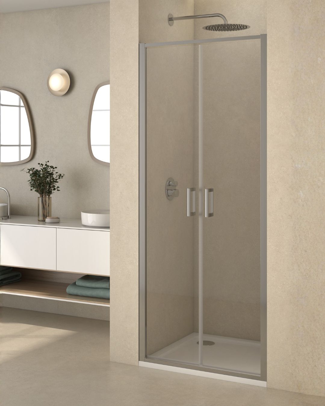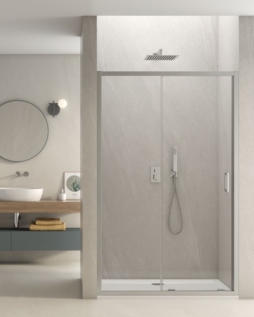 La Collezione “SUPER” è realizzata con cristallo temperato trasparente di spessore mm. 6 i profili sono in alluminio, finitura cromo, a sezione piatta, spessore frontale mm. 38, altezza H1900 mm., doppia maniglia interna/esterna in ABS con finitura cromo. La collezione “SUPER” dispone di n° 5 pareti scorrevoli componibili con larghezza mm. 700 – 800 – 900 – 1000 – 1200, composte da un vetro scorrevole ed un fisso in linea, chiusura con guarnizione magnetica. Le singole pareti facilitano enormemente la gestione del magazzino, riducono la possibilità di rotture durante il trasporto e la movimentazione, permettono la combinazione desiderata nell’installazione ad angolo, tutte le pareti sono reversibili DX / SX e sono abbinabili tra di loro. Nel sistema di apertura e chiusura delle pareti scorrevoli, per garantire la massima silenziosità, sono stati utilizzati carrelli in acciaio inox a doppia ruota con cuscinetti di scorrimento a sfera, fissi nella parte superiore, con pulsante di sgancio rapido nella parte inferiore per facilitare la rimozione dell’anta scorrevole durante le operazioni di pulizia del box doccia.